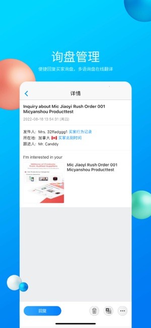- 查看、回复和管理询盘详情,包括询盘时间、买家信息、产品要求等。