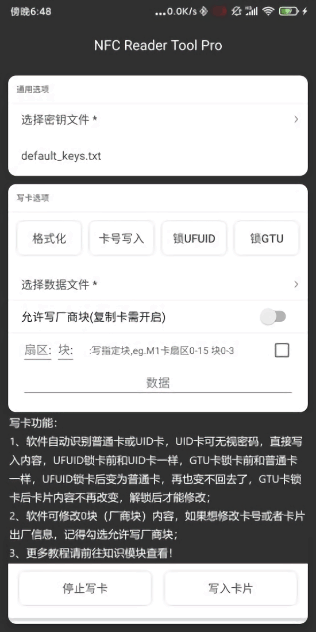 连接设备->点击一键写卡->选择数据文件>选择允许写厂商块->写入卡片