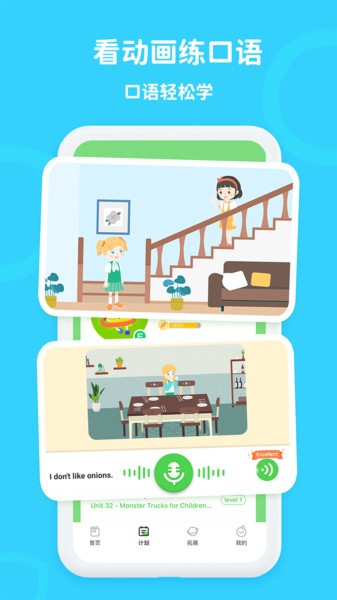 口语轻松学最新版是面向儿童提供英语启蒙口语学习的手机软件,采取动画视频引导学习,吸引兴趣,还提供游戏化方式趣味闯关练习,寓教于乐,大量英文绘本内容阅读,支持纠音打分,不断进阶,掌握更多英语词汇,提升语言能力!