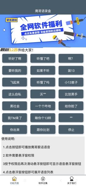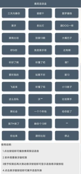 鹰哥语录盒软件是有着丰富的语音信息收录的软件,专门为玩游戏或者聊天搞怪设置,大家在操作的时候可以快速的找到合适的语音,在聊天的过程中可以充满趣味性的发送出去,轻松又实用!