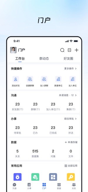 支持个人和组织的关系的建立,好友和成员的管理,家庭、群组、单位、部门、集团等各类组织形态的构建,快速将工作和业务关系数字化、在线化,支持灵活的权限、角色和岗位管理等不同颗粒度的访问控制功能。