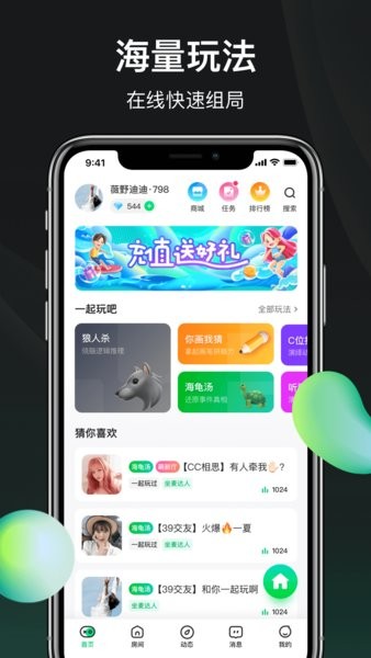 2023去玩app是一款以线上派对玩法为主的聚会娱乐应用,软件提供了聚会中玩的各种游戏,像经典桌游狼人杀,可以直接在app中连线游戏;app里面还有连麦唱歌,可以和网上爱音乐的朋友一起进行k歌。