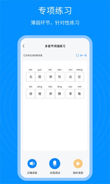提供全面的声母、韵母、声调、单音节字、多音节词、短文朗读等练习,薄弱环节针对性练习,让考试成绩更优。