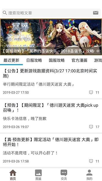 fgowiki最新版是好用的游戏助手工具,针对命运冠位指定游戏打造制作,实时推送最新的游戏资讯,提供大量游戏攻略可以阅读了解掌握,查看更多帖子,支持在线互动,一键收藏感兴趣的内容,还拥有图鉴详解、官方漫画,可以进行模拟抽卡等操作,使用十分方便!