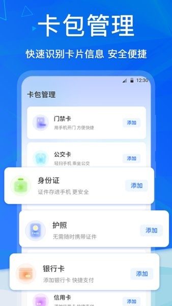 卡包管理:将银行卡,信用卡等信息存入卡包,使用时随时获取卡片信息,方便快捷