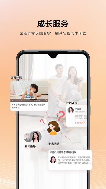 沉淀专业打造的课程学习内容及针对青少年儿童成长问题的解决方法。私人学习计划订制功能,通过简单问卷及目标预设方式,精准识别用户诉求,生成定制类学习内容推荐;父母好课聚合了精选家庭教育学习课程内容供用户学习;专家问答版块为用户提供专家在线咨询服务,帮助用户快速获取育儿痛点问题解答,并可根据问题浏览其他用户的相关提问及专业答复;成长顾问服务为用户提供专属儿童问题顾问服务。