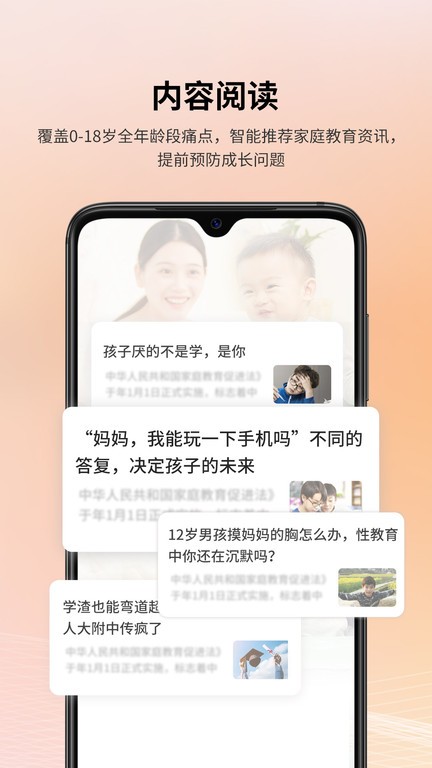 根据儿童具体年龄阶段及关注点偏好,展示贴合家长人群个性化精准诉求的家庭教育相关内容,包括时事热点资讯解读、同龄痛点问题解决、成长问题预防预警及可无限下拉阅读的信息流等内容,内容形式有长短图文、视频等多种展现形式。阅读版块的背后是一套7AM父母APP针对家庭教育及青少年儿童健康成长问题归纳的完备知识内容库体系,用户可通过标签及搜索系统,进行相关内容查找阅读。
