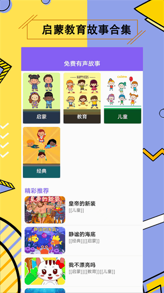 这里拥有各种童话、寓言故事、成语、儿歌、睡前故事、古诗词、英语故事等多种类型