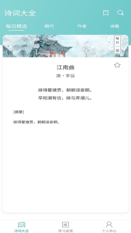 每日精选唐诗宋词元曲,分类丰富,按作者、按朝代,都能找到你想了解的诗词;搜索功能已更新,方便查找;