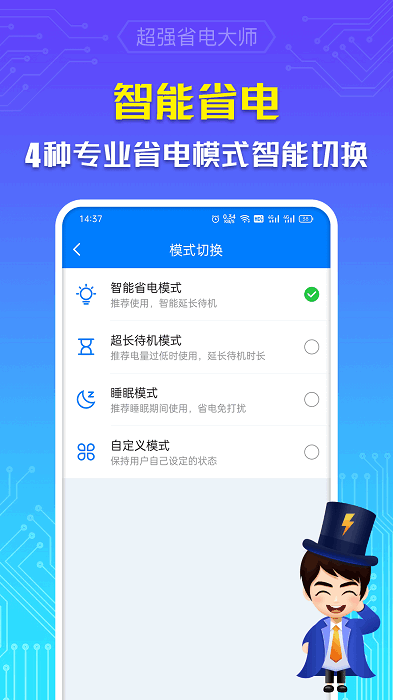 超强省电大师安卓版是可以帮助进一步智能节电的优化工具,现在有很多应用以及游戏耗电量都特别大,合理使用第三方工具可以帮助延长电池寿命,不管是节电、省电亦或是其它关于电池的功能,都能在这里找到对应的工具。