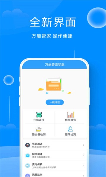 超级好用的手机WiFi网络工具箱,具有WiFi网络扫码、WiFi测速、WiFi信号增强、WiFi蹭网检测、WiFi信号检测、手机加速、充电保护电、内存清理等功能,能够保护用户安全上网,优化用户手机运行。万能管家钥匙实时掌握WiFi连接状态,为用户的网络安全做多重保障.