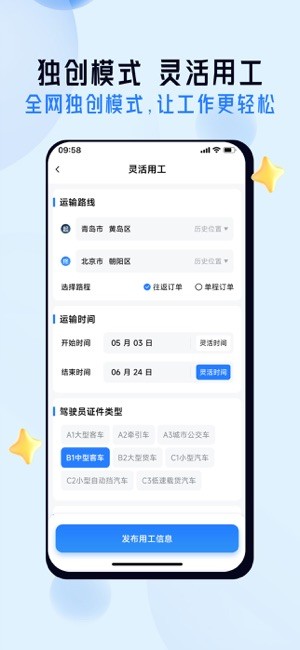3、支持多种运输路线、运输时间、驾驶员证件类型选择,灵活用工,轻松赚钱收益。