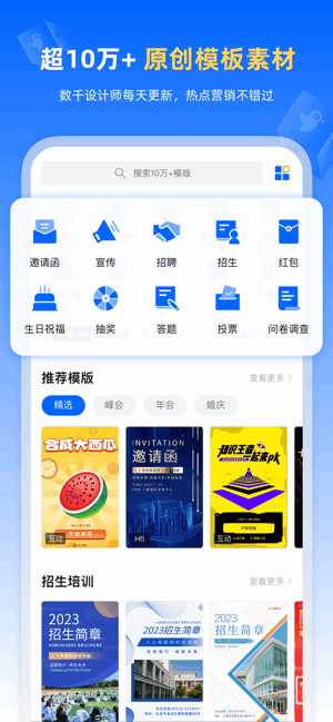 人人秀h5制作软件是功能强大的营销宣传助手,有超10万的原创模板素材,数千设计师每天更新,各种热点营销素材可以浏览使用,还提供超200的互动营销互动玩法,宣传海报轻松设计,3分钟即可制作h5微场景,适用于不同的场景使用!