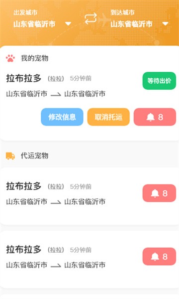 用户可以免费发布宠物托运相信息,寻求相关人员,等待宠物托运公司出价通知。