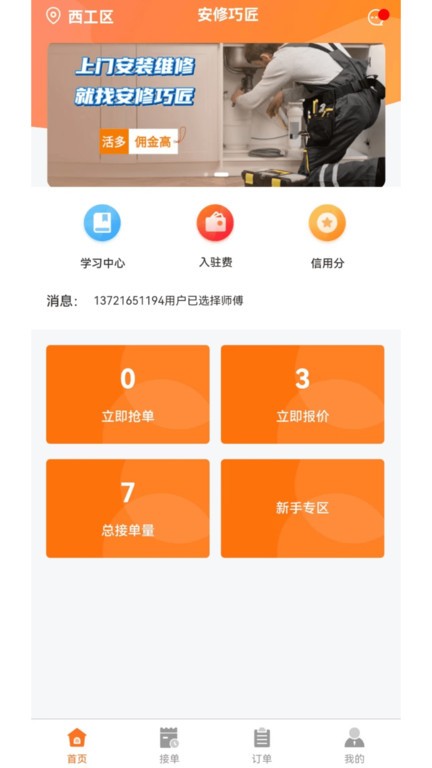 安修巧匠师傅端app可以帮助师傅进行入驻认证,每天都有订单精准推送,订单会按照分类排列好,接单更方便,可以在线报价,支持参与培训和学习,不断完善自己的硬实力,可以自由设置自己的工作状态,时间灵活,收入看得见!