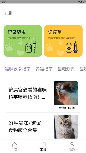 铲屎官助手,一款可以帮助铲屎官记录生活与学习养宠知识的软件,软件更新海量宠物相关知识信息,帮助爱宠人士掌握更科学的喂宠方案,完成对猫咪健康的检测,为猫咪很好的除虫检查身体,有需要的用户可以下载使用!