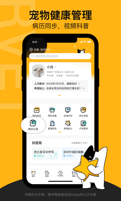 -- 线上管理爱宠就诊/美容信息,随时查看爱宠健康记录。