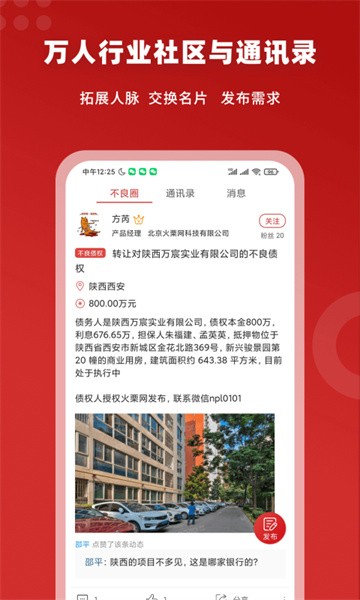 平台建立了以用户为核心的不良资产行业社区,方便用户发布对接业务需求,检索查找行业人脉与机构,设置了私信、换名片等功能方便从业者拓展人脉与业务关系。