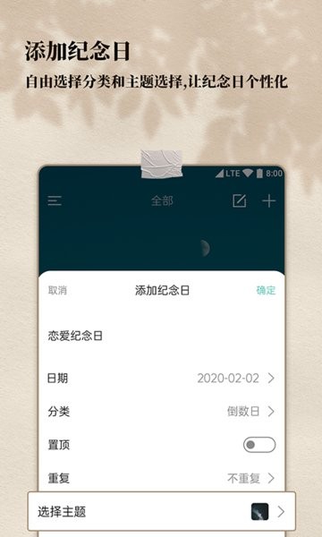 3、添加纪念日,自由选择分类和主题选择,让纪念日个性化。