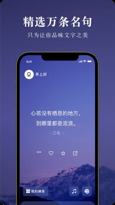 墨摘APP――汇集了千万条名言金句,在这里,你可以把读到的文字沉淀下来,成为自己的力量;或将你的所思所感表达出来,赋予他人力量。