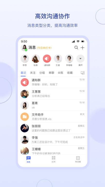 消息:企业即时通讯、应用消息提醒、待办、运营简报。