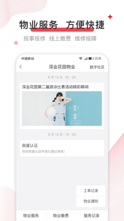 深业物业(集团)有限公司为旗下各服务小区准备的集报事报修、在线缴费、门禁系统、满意度调查、信息发布为一体的多功能APP,是业主租户的身边小帮手。