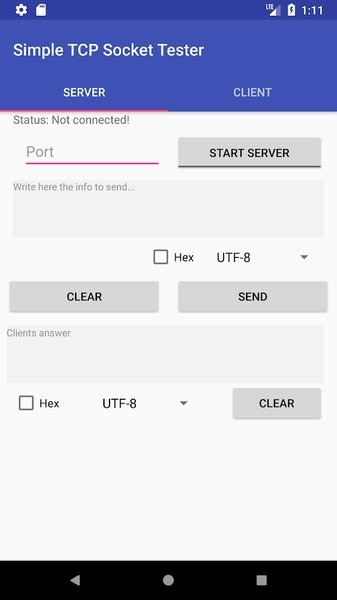 一个简单的应用程序给任何人需要测试TCP套接字。您可以在客户端或服务器模式发送和接收的字符串(UTF-8或ISO-8859-1)或字节在网络上。
