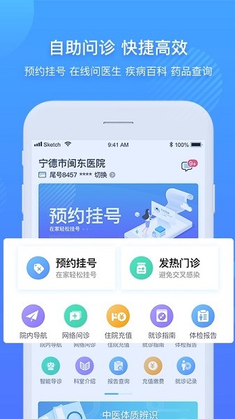 掌上医院闽东医院(公众版)以其智能强大的功能:智能导诊、预约挂号、分诊叫号、医院导航、专家介绍、就诊指南、自助查询、报告单、就诊记录、趣味自测、健康宣教、健康咨询。方便您随时随地进行预约看病,免去繁琐的排队挂号,节省了您宝贵的时间,从而解决了一系列看病难的问题。