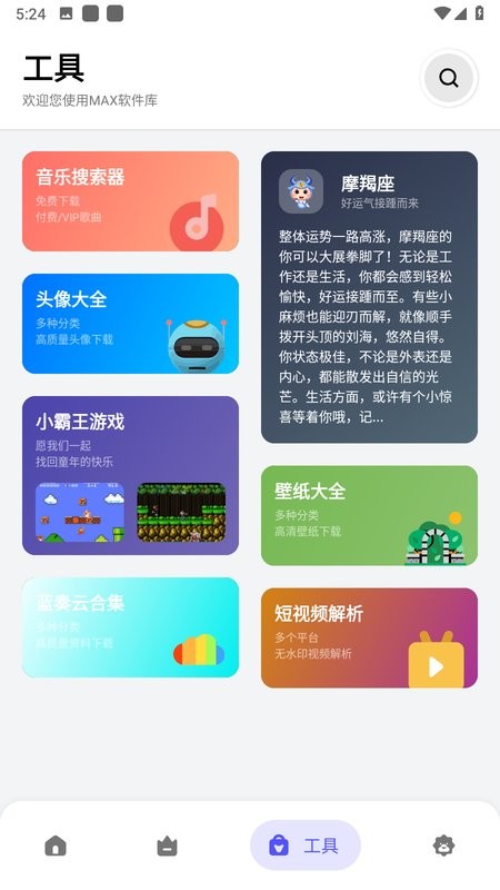 max软件库手机版是好用的软件库app,收录了大量不同类型的资源,各种各样的工具可以使用,包括音乐搜索器、小霸王游戏、头像大全、短视频解析等,原创软件、实用软件、福利软件、影视音乐、漫画等一网打尽,免费下载体验,操作简单便捷!