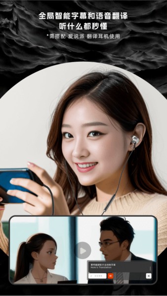 对不同语种的面对面交流进行双向实时翻译,屏幕上会出现双语字幕,同时耳机里也可以听到翻译前和翻译后的语音播报。