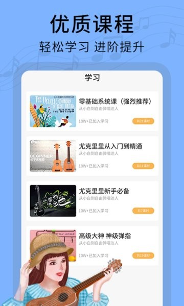 尤克里里曲谱软件是有着很多经典的尤克里里曲谱和各种调音器操作的软件,专为音乐爱好者设置,细节有着丰富的操作,除了基础的信息之外,课程设置也是从简单到困难,让大家可以循序渐进的学习!