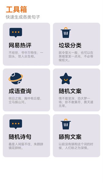 是一款输入自己感兴趣的标题内容就可以一键生成对应文章,支持复制,语句通顺,操作简单内容有趣。还有更多实用工具,网易热评、垃圾分类、成语查询、随机文案等多种小工具。 检讨书内容丰富,感情真挚,阅读通顺,完全不用担心会被发现; 有了这款软件,用户就不用在为不知道如何写检讨而烦恼了。