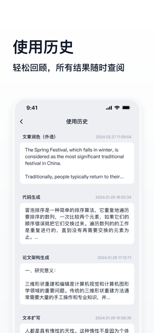 万能生成器软件是功能丰富的万能工具软件,不仅支持论文选题、文案写作、解梦大师、翻译、代码生成、起名大师等热门服务,还提供文本扩写、公文创作、外语翻译等功能,使用历史实时记录,一目了然,随时查看,满足用户需求!