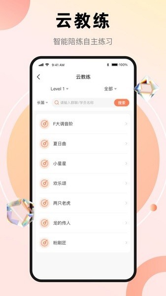 管乐团学生端是专门为学生提供乐团学习的应用软件,带来丰富的课程资源练习,提供专业的乐团学习工具,云教材、云练习、课后作业、阶段自测情况实时记录,还提供训练安排提醒功能,随时查看学习,不断巩固知识,提升能力!
