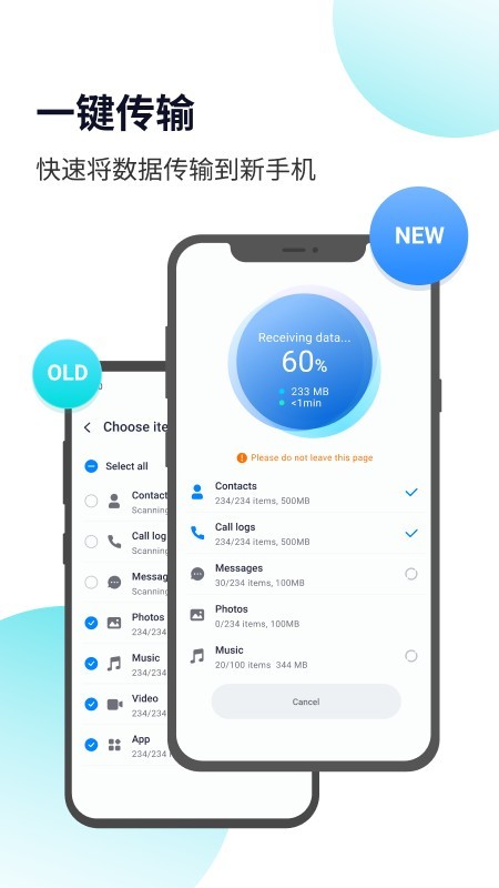 第二步:选择哪个手机是新手机和旧手机,扫描二维码,连接旧手机和新手机。