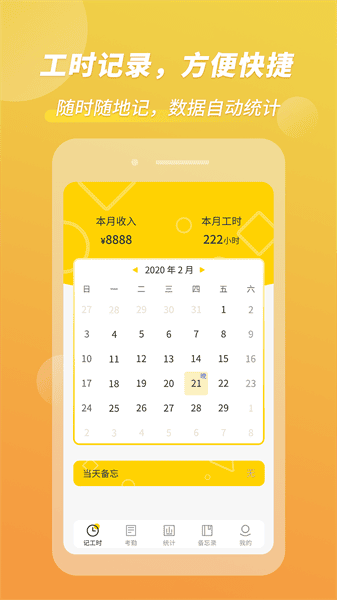 3.随手记录每天上班工时,自动统计加班工资。