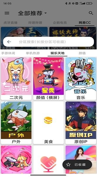 打开软件就可以看到满屏的直播间,游戏、颜值啥都有,没有任何的GG内容,软件顶部显示了它所包含的斗鱼、虎牙、哔哩哔哩、企鹅以及网易这5大直播平台。大家可以5大平台无缝切换。