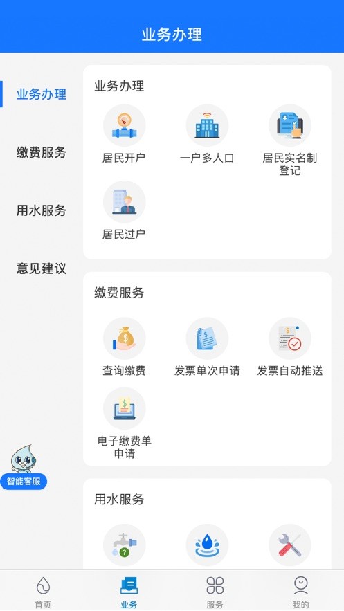 业务模块-从客户需求出发,分为业务办理、缴费服务、用水服务、意见建议4个一级菜单,方便客户快速找到所需服务