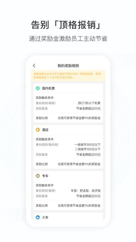 系统可以设置各级别人员相应的差旅消费标准,预设超额差标费用风控阈值。员工在预订时自动匹配差标,超过后系统可预警,助您轻松降低差旅支出成本;