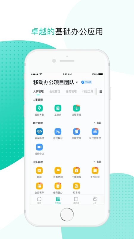 2、集齐各大移动办公应用,让您随时随地轻松办公。支持发送语音短信、图片和文字,可以群聊,让沟通更顺畅