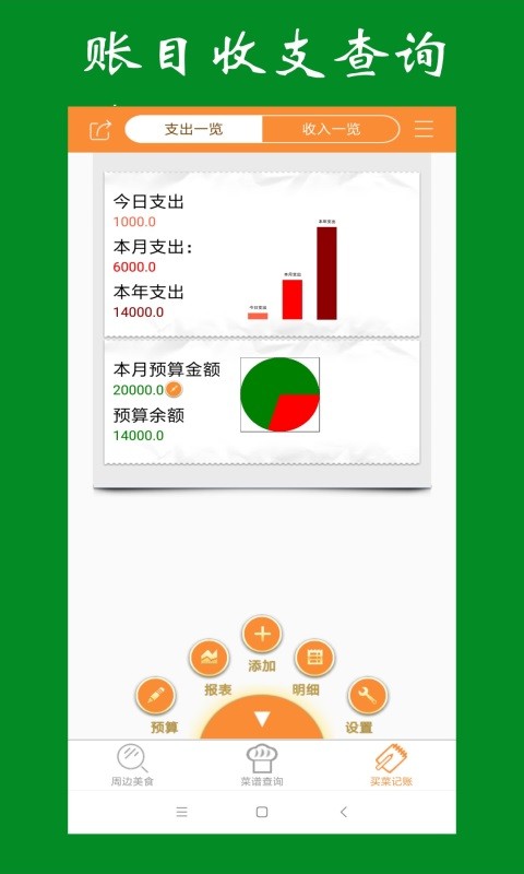 4、随时查看支出、收入一览表,可以快速的查看今日、本月、本年的支出情况;