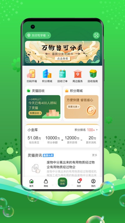 灵猫回收app为环保增添更多助力,这是一个为专门提供以及垃圾回收相关的服务平台。在软件中你不仅能快捷搜索到垃圾分类知识,同时还能申请垃圾袋以及进行垃圾回收,服务范围十分广泛。