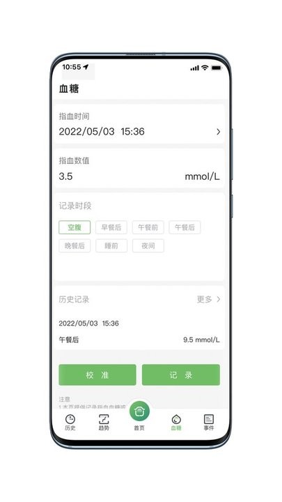 该页面展示血糖提示信息、事件展示以及血糖记录数据