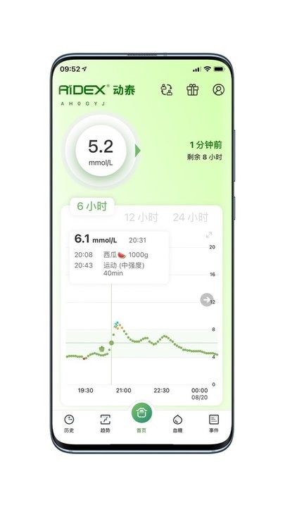 首页显示当前血糖检测值以及该数值获取的时间,显示一段周期内(6小时或12小时或24小时)的历史血糖趋势
