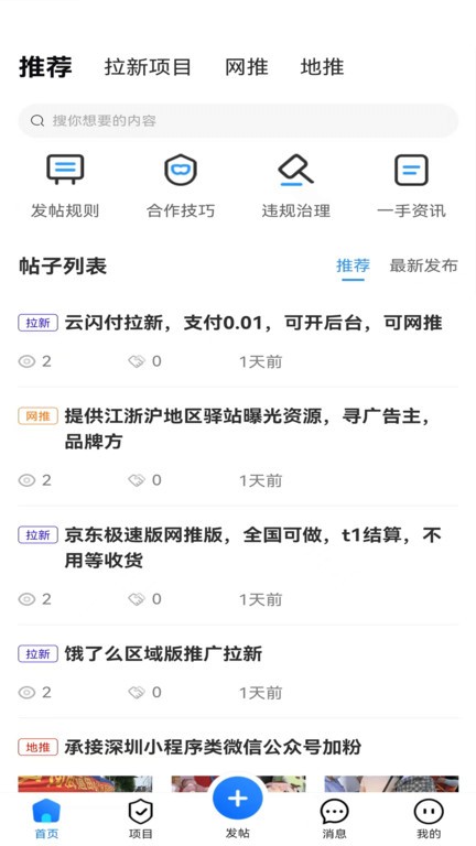 项目之家为从事APP推广拉新的网推和地推人员提供了一个免费拓展合作的地方,用户可在项目之家免费发布合作,免费对接人脉资源,异业合作,是一个一手地推拉新项目对接平台。