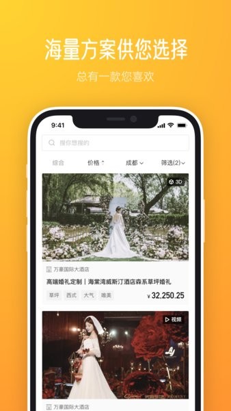 橙婚婚庆为用户带来更多优秀的婚庆服务,让用户可以在这里获得想要的婚礼,一站式的婚礼服务,海量的婚礼方案可以让用户进行选择,更加清晰的婚礼报价让用户可以自由搭配自己的预算。