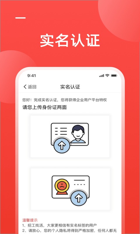 在使用时需要进行实名认证,打造一个安全靠谱的劳务招工找活干平台;