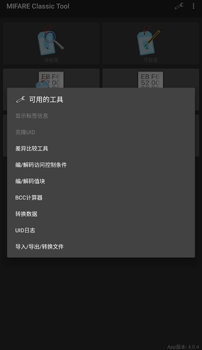 mifare经典工具中文版app最新版(复制门禁卡)又称mifare读写工具app,是一个用于模拟门禁卡的软件,通过手机nfc功能来复制改水卡、饭卡、公交卡、加密门禁卡等,以后使用手机就可以刷卡了,带来更加方便的体验。