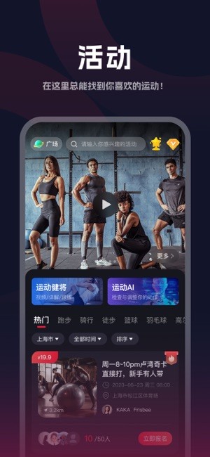 新潮运动,热力排行,体验Z世代年轻人的运动模式,线上预约,线下相聚,社恐也能轻松社交;打卡签到,动态分享,给社牛一个展示自我的平台;
