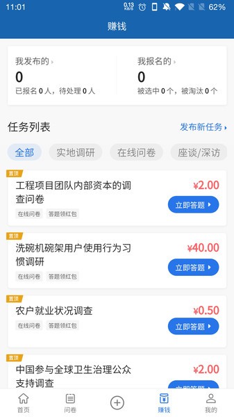 接任务: 答问卷领红包、接调研任务赚劳务佣金